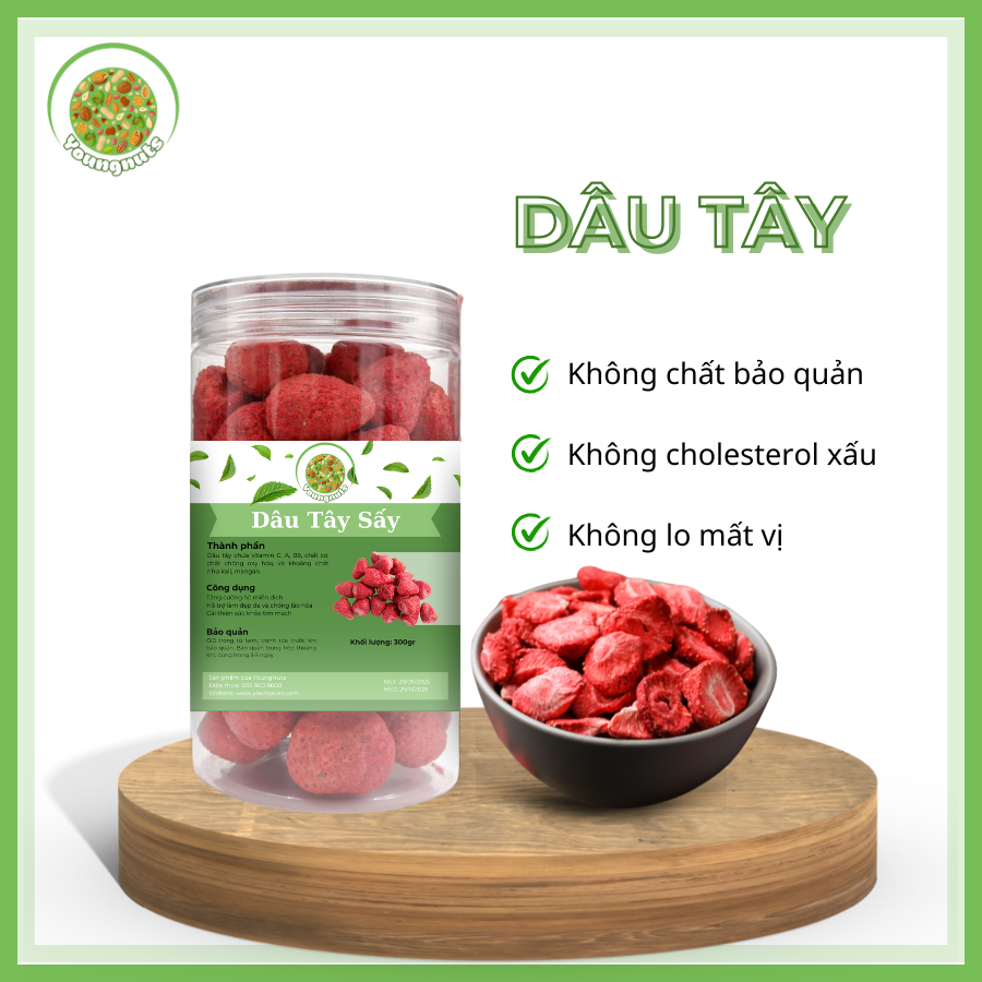 Dâu tây sấy giòn YoungNuts là món ăn vặt hoàn hảo dành cho những ai yêu thích sự giòn rụm, chua ngọt nhẹ nhàng và quan tâm đến sức khỏe. Hãy thử ngay hôm nay để cảm nhận sự khác biệt từ từng miếng dâu thơm ngon tự nhiên!